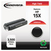 Remanufactured Black Toner, Replacement for 15A (C7115A), 2,500 Page-Yield. Innovera® remanufactured monochrome laser print cartridges provide the same quality and performance as the national brands at an affordable price. These cartridges are remanufactured in ISO 9001:2008-certified facilities using the highest quality chemical toners and components to ensure they meet or exceed national brand page yield and print performance—guaranteed. Device Types: Laser Printer; Color(s): Black; Page-Yield: 2,500; Supply Type: Toner.