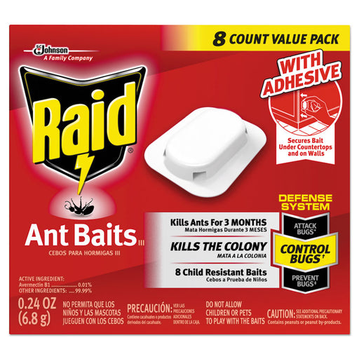 Raid Ant Baits III with adhesive secures bait under countertops and on walls to kill ants where they hide for up to three months. After ants feed o...