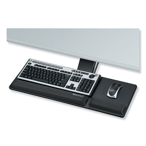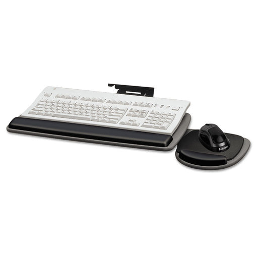 Fellowes® Office Suites™ Deluxe Keyboard Drawer moves keyboard and mouse off the desktop to save workspace. Features 3 height adjustments to suit p...