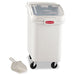 ProSave Mobile Ingredient Bin, 26.18 gal, 15.5 x 29.5 x 28, White, Plastic. The Rubbermaid Commercial ProSave Ingredient and Food Storage Mobile Bin is a bulk food storage container on wheels. With a slanted front, sliding opening, and 32-ounce scoop, these food storage containers makes it easy to transport ingredients. These bulk food storage containers feature 2 fixed front casters and 2 swivel rear casters that provide superior maneuverability. The mobile bin has a white bottom and clear lid for easy identification of ingredients. Food Container Type: Ingredient Bin/Pail; Material(s): Structural Web Plastic; Capacity (Volume): 26.18 gal; Color(s): White.