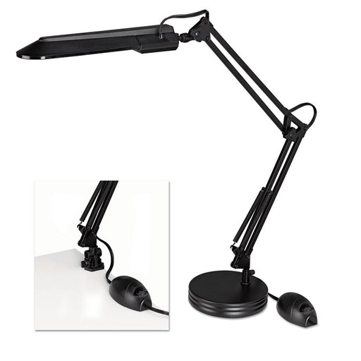 Multi-functional task lamp with attachable base for desktop use or an attachable clamp to attach to surfaces up to 2 1/4" thick. Swing arm with two...