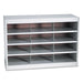 Steel Project Center Organizer, 12 Pockets, 37.5 x 15.75 x 25.75, Gray. Steel frame, shelves and dividers support heavy reports with a fiberboard back. Interlocking design of shelves and dividers provide extra strength. 12"w x 15 1/4"d x 4 3/4"h compartments hold any size printout. Room on front for labels (not included). Use on the floor, desk or mounted to the wall. All hardware included. Holds 18,00 sheets of paper. Literature Sorter Type: Open Front; Number of Compartments: 12; Compartment Size: 15 1/4" x 4 3/4" x 12"; Material(s): Steel.