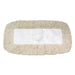 Dust Mop, Disposable, 5 x 30, White. Four-ply cotton/synthetic blend pretreated yarns. Open synthetic backing with ties. Sewn center fringe for added coverage.