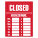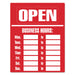 Business Hours Sign Kit, 15 x 19, Red. Business Hours 15" x 19" sign allows you to display your business hours along with a rotatable "Open" and "Closed" sign. Static cling letters and numbers included. Frame Color: Red; Size: 15 x 19; Message(s): Business Hours; Material(s): Plastic.