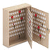 Locking Two-Tag Cabinet, 240-Key, Welded Steel, Sand, 16 1/2 x 4 7/8 x 20 1/8. The Dupli-Key system utilizes two different sets of numbered key tags. Attach your master keys to the red octagonal-shaped self-locking key tag and fasten duplicate loaner keys to white oval-shaped, snap-hook key rings. When a loaner key is issued, insert a receipt slip in the brass holder and place on hook. Keep track of all vital key information in the Cross Reference Index Kit (included). Key Capacity: 240; Material(s): Welded Steel; Color(s): Sand; Width: 16 1/2".