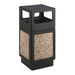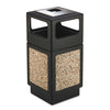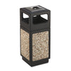 Canmeleon Side-Open Receptacle, Square, Aggregate/Polyethylene, 38 gal, Black. Molded stone aggregate for any first impression area with a recessed bottom. High-density polyethylene plastic will not chip or dent. UV inhibitors limit fading in sunlight. Adaptable for anchoring and weighting devices. Uses standard 32" x 44" trash bags and telescoping base hides bag. Side Opening Style—Four 13" x 6" disposal openings. Waste Receptacle Type: Indoor/Outdoor All-Purpose Waste Bin; Material(s): Polyethylene; Application: Indoor/Outdoor All-Purpose Waste Disposal; Capacity (Volume): 38 gal.