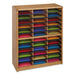 Steel/Fiberboard Literature Sorter, 36 Sections, 32 1/4 x 13 1/2 x 38, Oak. This simple yet effective organizing tool has so many uses: a mailbox, material holder, stationery sorter, craft or office supply storage. Steel shell and support shelves add stability and durability. Letter size, 9 3/4w x 12 1/2d x 2 1/2h compartments are made from heavy-duty corrugated fiberboard. Wide shelf front serves as label area (labels included). Easy assembly with quick-locking fasteners. Over-sized compartments hold up 550 sheets of paper. Literature Sorter Type: Open Front; Number of Compartments: 36; Compartment Size: Letter; Material(s): Steel; Corrugated Fiberboard.