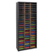 Steel/Fiberboard Literature Sorter, 72 Sections, 32 1/4 x 13 1/2 x 75, Black. This simple yet effective organizing tool has so many uses: a mailbox, material holder, stationery sorter, craft or office supply storage. Steel shell and support shelves add stability and durability. Letter size, 9 3/4w x 12 1/2d x 2 1/2h compartments are made from heavy-duty corrugated fiberboard. Wide shelf front serves as label area (labels included). Easy assembly with quick-locking fasteners. Over-sized compartments hold up 550 sheets of paper. Literature Sorter Type: Open Front; Number of Compartments: 72; Compartment Size: Letter; Material(s): Steel; Corrugated Fiberboard.