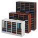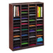 Wood/Fiberboard E-Z Stor Sorter, 60 Compartments, 40 x 11.75 x 52.25, Mahogany, 2 Boxes. A great addition to mailroom, office, school or store. Stores and organize literatures up to 8 1/2 x 11 in large 3" high compartments to hold up to 750 sheets of paper. Attractive, durable laminate with radius corners. Constructed of 3/4" furniture-grade compressed wood. Customize your storage with the removable hardboard shelves that allow you to expand compartment size. Solid fiberboard back. Black plastic label holders (labels included). Easy assembly with cam-lock fasteners. Literature Sorter Type: Open Front; Number of Compartments: 60; Compartment Size: Letter; Material(s): Fiberboard/Hardboard.