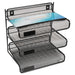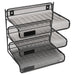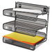 Mesh Three-Tier Letter Size Desk Shelf, 10 x 7 x 9 3/8, Black. Holds letter size materials. Durable construction stands up to daily wear-and-tear. Area for label (labels sold separately) on each shelf for quick identification. Can be hung on partition wall for off-desk storage or stand alone for more organization. Width: 10"; Depth: 7"; Height: 9.38"; Color(s): Black.