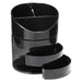 Small Storage Divided Pencil Cup, Plastic, 4 1/2 dia. x 5 11/16, Black. Multifunctional pencil cup holds a variety of supplies and helps keep your desktop clutter-free. Three swivel drawers hold clips, push pins and binder clips. Two deep compartments handle scissors, rulers and pencils; front tray keeps rubber bands, business cards and erasers in place. Plastic construction. Pencil Cup Type: Divided; Color(s): Black; Color Family: Black; Material(s): Plastic.
