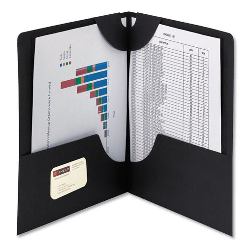 Large pockets safely hold documents while keeping the material accessible. Left pocket is die-cut for business card. Textured stock is attractive a...
