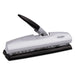 20-Sheet LightTouch Desktop Two- to Seven-Hole Punch, 9/32" Holes, Silver/Black. The wide grip, soft-touch lever makes punching large quantities 50% easier than with standard desktop punches. Top-quality cutting action with patented pin technology delivers clean and precise holes. Punch heads adjust for two- or three-hole punching; adjustable up to seven holes (additional heads sold separately). Multiple hole placements offer exceptional flexibility. Lever locks down for space-saving convenience. Paper-size adjustable. Pull-out tray for easy chip disposal. Durable metal construction. Sheet Capacity: 20; Operating Method: Manual; Number of Holes: 2-7; Hole Diameter: 9/32".