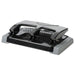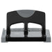 45-Sheet SmartTouch Three-Hole Punch, 9/32" Holes, Black/Gray. Reduced effort manual design requires up to 40% less force than a standard paper punch. Soft grip handle locks down for storage making for a more comfortable, simpler option. Great for light use in the office. Fixed heads create three 9/32" holes. A hole pattern in the punch base provides visibility into chip tray to see when it is full. Back opening and a removable base allow easy emptying of paper chips. Durable metal construction. Sheet Capacity: 45; Operating Method: Manual; Number of Holes: 3; Hole Diameter: 9/32".