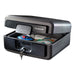 HD2100 Safe, 0.37 cu ft, 15.5w x 14.4d x 7.6h, Black. This chest is the perfect solution for protecting important documents and valuables from threats of fire, flood, and theft. Privacy key lock security helps prevent unwanted access to items and a spacious interior and in-lid straps allow for safe, organized storage. Outer Width: 15.5"; Outer Depth: 14.4"; Outer Height: 7.6"; Capacity (text): 0.37 cu ft.