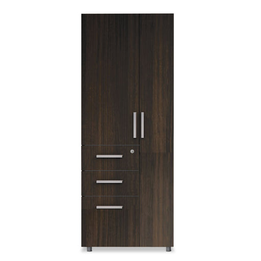 Durable thermally-fused laminate tower offers a variety of storage opportunities: 7-3/4" wide wardrobe section with coat rod, top storage cabinet w...