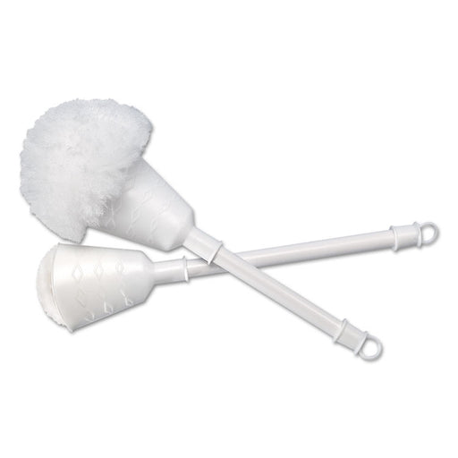 5" diameter holder conceals brush. White plastic. Handle Material: Plastic; Diameter: 5"; Color(s): White.
