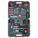 119-Piece Tool Set. Tool set includes 30 sockets (SAE and metric), 3/8" drive ratchet, spark plug socket, 3" extension bars, wrenches, pliers, 39 bits with holder, 24 hex keys, hammer, torpedo level, tape measure and four screwdrivers. Tool Kits Type: Combination Set; Number of Pieces: 119.