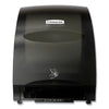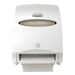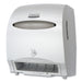 Electronic Towel Dispenser, 12.7w x 9.572d x 15.761h, White. Reduce the hassle of restroom maintenance with the high-capacity Kimberly-Clark Professional Automatic Towel Dispenser. This touchless, wall mount roll towel dispenser needs infrequent refilling and provides consistent, reliable performance. Your washroom guests will enjoy the benefits of hygienic, touch free dispensing - they'll only touch the towel they're using. This high capacity towel dispenser is made of high impact smoke colored plastic. The unit dispenses a nominal 11" of towel when activated by placing hand under the unit. A second sheet will dispense at 10% reduced length when activated within a few seconds. Features include a quiet dispensing system, quick load capability and choice of key-activated spring lock or push button operation. Towels Dispensers Type: Hardwound Roll Towel Dispenser; Material(s): Plastic; Capacity (text): 950 ft Roll; Color(s): White.