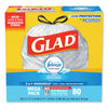 OdorShield Tall Kitchen Drawstring Bags, 13 gal, 0.95 mil, 24" x 27.38", White, 80/Box. Glad OdorShield Trash Bags provide strength plus odor control, to keep your home smelling fresh and clean. These kitchen garbage bags are made with OdorShield technology and Febreze freshness for guaranteed 5 day odor control, based on lab test compared to unscented bags. The unique diamond pattern in these drawstring bags, stretches around objects to prevent rips and the reinforcing bands help add strength while reducing plastic waste, when compared to a leading branded bag. These trash can liners are reinforced at the top, middle and bottom and are made with thicker plastic for leak protection. With the 3 ply drawstring, which grips the can, the bag stays in place until you are ready to take it out. The drawstring bag makes closing and carrying easy. These 13 gallon size, odor eliminating, trash bags, fit tall kitchen trash cans, and are perfect for use in busy kitchens, offices or seasonal cleaning like Spring Cleaning and Back to School. Application: Can Liner; Capacity Range (Volume) [Max]: 13 gal; Thickness: 0.95 mil; Grade: Extra Heavy-Duty.