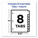 Insertable Big Tab Plastic 1-Pocket Dividers, 8-Tab, 11.13 x 9.25, Assorted, 1 Set. Strong organization and storage capabilities are yours with the help of these Big Tab™ Two-Pocket Insertable Plastic Dividers. Each divider features double plastic pockets, one on each side of the divider, to provide extra storage space for your important papers. The Big Tab™ design allows you to use larger fonts or more lines of text than on typical inserts for easier reading or more detailed labeling. Use a free template from Avery Design & Print to customize tabs titles onto the included label sheets using your computer and printer. The tabs' unique design keeps inserts from falling out, so your dividers stay securely labeled. Constructed with durable plastic, these dividers offer lasting organization in a big way. Handwrite or print inserts on laser and inkjet printers. Single-Pocket—Front pocket for storage. Index Divider Style: Customizable; Index Divider Size: 11.13 x 9.25; Punched/Unpunched: 3-Hole Punched; For Use With: Ring Binders.