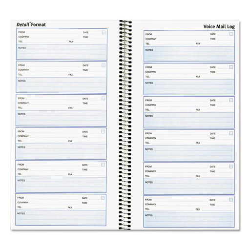 White forms with blue-shaded notes space. Space to record Caller, Company, Phone/Fax numbers, Date, Time and Notes, with additional lines for detai...