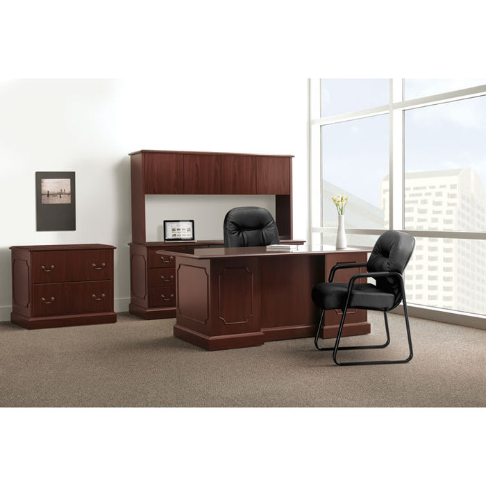 94000 Series Double Pedestal Desk, 72w x 36d x 29.5h, Mahogany. 18th century elegance, 21st century engineering. Traditional style with distinctive plinth base and antique brass-plated hardware. Mirror-finish, high-pressure laminate top for ease of care. Woodgrain laminate end panels and drawer fronts. Drawers operate on ball bearing suspensions; file drawers extend fully and accommodate letter or legal size hanging files, box drawers extend three-quarters. Center drawer with central locking system locks all drawers. Color: Mahogany; Color Family: Mahogany; Pedestal Count: 2; Top Shape: Rectangular.