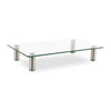 Adjustable Tempered Glass Monitor Riser, 22.75" x 8.25" x 3" to 3.5", Clear/Silver. Elevate your monitor to a proper eye position with this sleek looking tempered glass monitor riser. Adjustable stainless steel feet allow the user to rise or lower their monitor riser easily and provides increased storage room beneath the desktop. Supports up to 44 lb. and screen sizes of 13"-22". Stand Type: Monitor; Width: 22.75"; Depth: 8.25"; Maximum Height: 3.5".