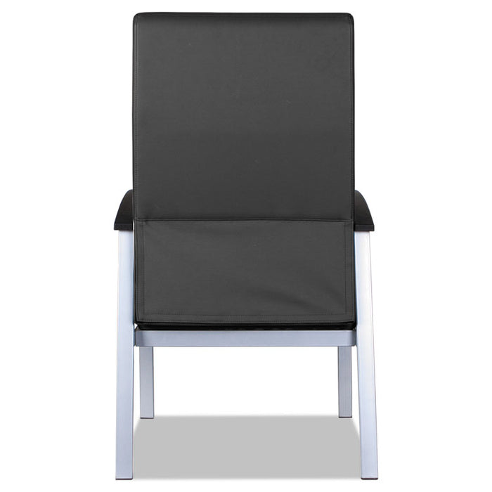 Alera metaLounge Series High-Back Guest Chair, 24.6" x 26.96" x 42.91", Black Seat/Back, Silver Base. Stylish and flexible design is ideal for office reception areas to waiting areas and more. Thickly padded seat cushion relieves pressure points at the back of the knees. Visible clean-out area between the back and seat prevents dirt and debris build-up. Strong metal frame withstands heavy use and offers added durability and strength. Wall-saver leg design helps protect against wall damage. Polyurethane arms are both comfortable and long-lasting. Recommended Applications: Guest; Reception; Waiting Room & Lounge; Seat Color: Black; Back Color: Black; Color Family: Black.