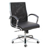 Alera Neratoli Mid-Back Slim Profile Chair, Supports up to 275 lbs., Black Seat/Black Back, Chrome Base. Contemporary cushioned seating with a slim profile. Waterfall seat reduces pressure on the back of the knees for improved circulation. Padded arm caps for comfort and support. Five-star base with casters for easy mobility. Leather Seat & Back. Recommended Applications: Executive & Management; Seat Color: Black; Back Color: Black; Color Family: Black.