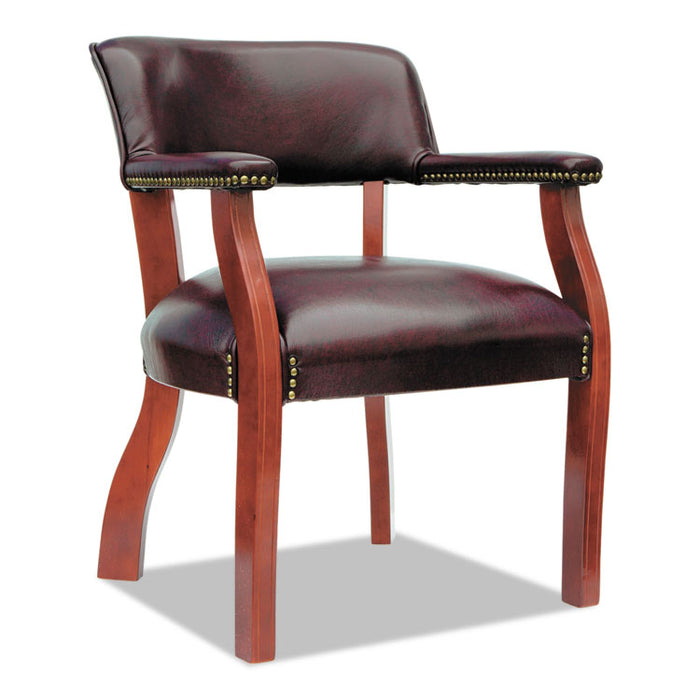 Alera Traditional Series Guest Arm Chair, 24" x 24.5" x 29.5", Oxblood Burgundy Seat/Oxblood Burgundy Back, Mahogany Base. Handsomely appointed and attractively priced for the fiscally discerning executive. Traditional "bankers" styling with brass nailhead trim. Deep cushioned vinyl upholstery. Genuine hardwood frame with a rich mahogany finish. Padded arms for comfort and support. Straight wood legs. Recommended Applications: Guest, Reception, Waiting Room & Lounge; Seat Color: Oxblood Burgundy; Back Color: Oxblood Burgundy; Color Family: Red.