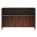 Alera Valencia Series Reception Desk with Transaction Counter, 71" x 35.5" x 42.5", Modern Walnut. Commercial-grade laminate work surface and side panels are water-, scratch- and stain-resistant. Bow-shaped transaction counter and high-sided panels for privacy. Protective 3mm edge banding helps prevent damage from bumps. Two grommets for cable and wire