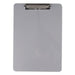 Aluminum Clipboard with Low Profile Clip, 0.5" Clip Capacity, Holds 8.5 x 11 Sheets, Aluminum. Heavy-duty, weather-resistant aluminum clipboard features a smooth writing surface with rounded corners and edges. Low-profile safety clip eliminates the possibility of accidental openings, while making the clipboard easier to store in briefcases, file cabinets, laptop bags and more. Sized to accommodate standard, letter-sized documents. Holds Paper Size: 8.5 x 11; Clipboard Actual Size: 9w x 12.5h; Clipboard Material: Aluminum; Clip Capacity: 0.5".