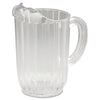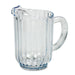Bouncer Plastic Pitcher, 60oz, Clear. Designed for safety and lower replacement costs. Polycarbonate plastic resists chipping and breaking. Drip-proof spout, self-draining bottom. Dishwasher-safe. Capacity (Volume): 60 oz; Color(s): Clear; Material(s): Polycarbonate; Handle Color: Clear.