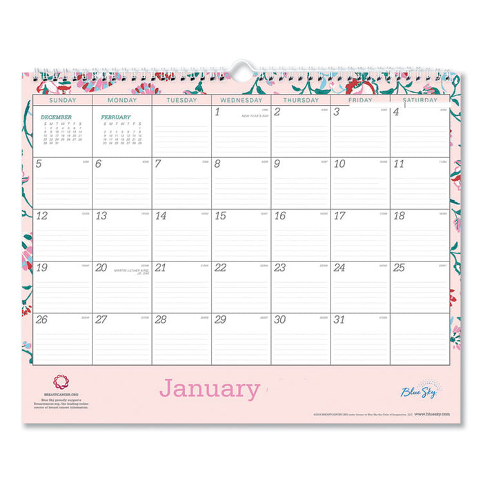 Breast Cancer Awareness Wall Calendar, 15 x 12, 2020. Display your support of breast cancer awareness while managing your schedule with this wall calendar. Use as a writing surface to jot down notes, ideas, appointments, reminders and more. Dated planning pages range 12 months from January to December. One page per month format includes Sunday through Saturday scheduling, count of days/days remaining, holidays, and past and future months reference. Wirebound wall calendar is printed on thick, premium quality, acid free pages that reduce ink bleed-through. Twin-wire binding features a sturdy, wall mount hook for secure hanging. Blue Sky proudly supports Breastcancer.org by donating a portion of each sale to the leading online source of breast cancer information. Size: 15 x 12; Page Color/Theme: Breast Cancer Awareness; Appointment Ruling: None; Edition Year: 2020.