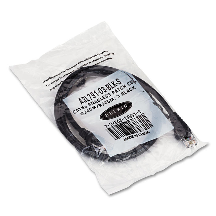 CAT5e Snagless Patch Cable, RJ45 Connectors, 3 ft., Black. Premium patch cable delivers reliable performance in 10/100Base-T networking applications. Fifty-micron, gold-plated connectors ensure clean, clear transmissions. Rigorous PowerSUM testing is designed to exceed Cat5e standard performance requirements. Snagless Molded. Cable Type: Cat5e Patch Snagless Molded; Connector/Port/Interface: Two RJ 45 Male; For Device Type: Mac®; Network; PC; Connects Devices (From/To): Hardware in 10 Base-T and 100 Base-T Networks.