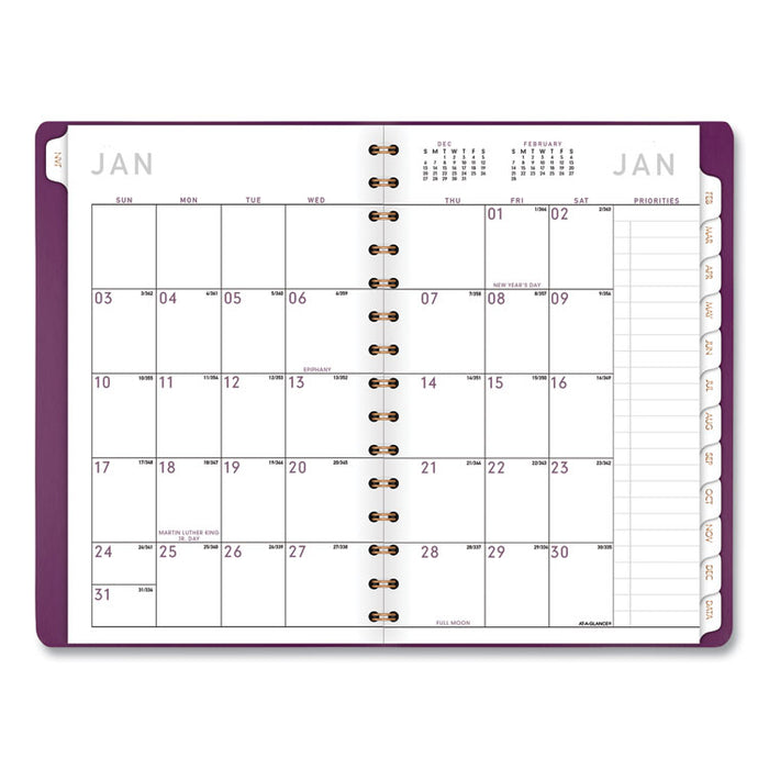 Contemporary Weekly/Monthly Planner, 8 x 4 7/8, Purple, 2020. Unique cover with contemporary design for a modern-day look. Premium paper resists ink bleed. Tabbed for quick reference and navigation. Weekly: one week per two-page spread. Monthly: tabbed one month per two-page spread with unruled blocks, past and future months reference. Space for priorities and notes. Special information pages with plenty of space for note taking and project management. Federal holidays highlighted. Printed on premium paper. Weekly & Monthly: Open-block format. Size: 8 x 4.78; Page Color/Theme: Purple; Appointment Ruling: Open Scheduling; Edition Year: 2020.