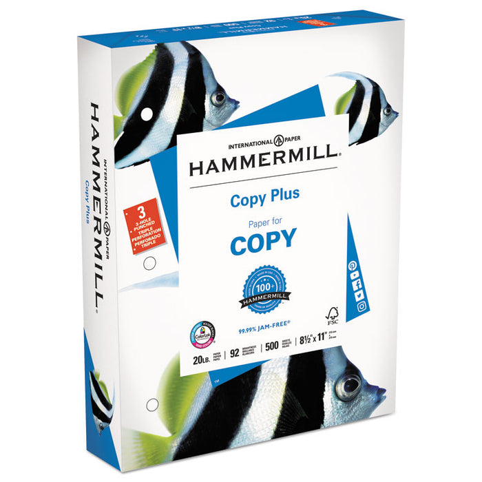 Copy Plus Print Paper, 92 Bright, 3-Hole, 20 lb Bond Weight, 8.5 x 11, White, 500/Ream. Copy Plus printer paper is an economical paper designed for everyday use at offices large and small. Offering dependable performance on all office machines, you'll want to have plenty of this dependable paper on hand for everyday, general office use. It works well in high-speed copiers, dry toner plain-paper copiers and fax machines. ColorLok® for bolder blacks, brighter colors and faster drying. Backed by the 99.99% Jam-Free® Guarantee. Acid-free material prevents yellowing over time to ensure a long-lasting appearance. This product was made from wood sourced from a certified managed forest. 3-Hole Punched. Sheet/Roll Size: 8.5 x 11; Paper Basis Weight (lb): 20 lb; Paper/Media Color(s): White; Color Family: White.