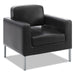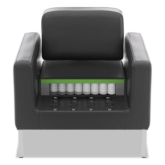 Corral Club Chair, 31.5" x 28" x 30.5", Black Seat/Back, Platinum Base. Make an enduring impression and achieve lasting savings. This classic contemporary club chair offers even more than meets the eye. The seat cushion is uniquely engineered for comfort, with over 50 individually wrapped coil springs that reduce pressure points. The back floats above the seat, so cleaning is simple. The style is so impressive, people will assume you spent a lot more than you did. SofThread™ leather upholstery. Recommended Applications: Guest, Reception, Waiting Room & Lounge; Seat Color: Black; Back Color: Black; Color Family: Black.