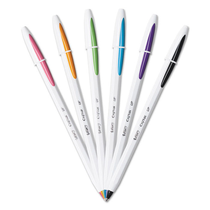 Cristal Up Stick Ballpoint Pen, Medium 1.2mm, Assorted Ink, White Barrel, 6/Pack. Cristal® Up Ball Pen is fun and trendy with a barrel design. It is the iconic BIC® Cristal® with a modern twist! Features a two-toned color cap. Non-refillable. Pen Sub-Brand & SKU Line: Cristal® Up; Pen Style: Stick; Pen Type: Ballpoint Pen; Refillable (Yes/No): No.