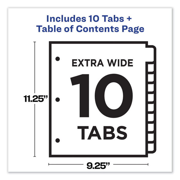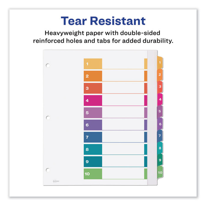 Customizable TOC Ready Index Multicolor Dividers, 10-Tab, Letter. Organized documentation makes a business run like a well-oiled machine. These Ready Index® Table of Contents Dividers help you stay organized so you can locate documents quickly and efficiently. They feature preprinted multicolor tabs that can be displayed in either landscape or portrait format. Using free templates from Avery Design & Print you can customize the included table of contents page and print in minutes. Organization and efficiency—makes life better for your business. For laser and inkjet printers. Extra Wide—Tabs extend beyond sheet protectors. Index Divider Style: Arabic Numeric; Index Divider Size: 11 x 9.25; Punched/Unpunched: 3-Hole Punched; For Use With: Ring Binders.