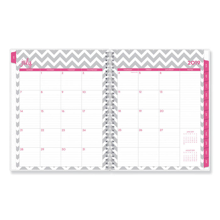 Dabney Lee Ollie Academic Weekly/Monthly Planner, Gray Chevron, 8.5 x 11, 2020-2021. The Dabney Lee "Ollie" frosted cover academic planner will add colorful flair to any desk or workspace. Durable monthly tabs allow for easy access to each month while weekly views per two-page spread offer ample writing space. Silver twin-wire binding finishes the look and offers easy page turning. Thick premium pages reduce ink bleed-through. Includes yearly reference calendars, holiday and contacts pages. The Dabney Lee for Blue Sky collection combines bright, bold and preppy designs. The patterns reflect a love of color, vibrant detail and a fun lifestyle. Dated July - June with two bonus monthly views (May - June). Size: 11 x 8 1/2; Page Color/Theme: Gray Chevron; Appointment Ruling: None; Edition Year: 2020-2021.