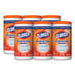Disinfecting Wipes, 7 x 8, Orange Fusion, 75/Canister, 6 Canisters/Carton. Clean and disinfect multiple surfaces in one easy step. These sanitizing wipes power through grease, soap scum and grime and kill germs that can live on surfaces for up to 48 hours. Each cleaning wipe can effectively kill common bacteria, including staph, salmonella, strep, MRSA, E. coli and the cold and flu viruses, and influenza A2 virus, in as little as 30 seconds. They also remove allergens like cat and dog dander, dust mite debris and pollen. These antibacterial wipes are easy to use and work great on a variety of hard, non-porous surfaces including finished hardwood, stainless steel, mirrors and glass. Ideal for use in schools, restaurants, offices and other commercial facilities. Value Pack—Stock up and save! Towel/Wipe Type: Disinfecting Wipes; Application: Bathrooms; Gyms; Hospitals; Kitchens; Offices; Schools; Day Care Centers; Applicable Material: Acrylic; Ceramic; Chrome; Fiberglass; Glass; Metal; Plastic; Tile; Vinyl; Wood; Material(s): Non-Woven Fiber.