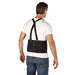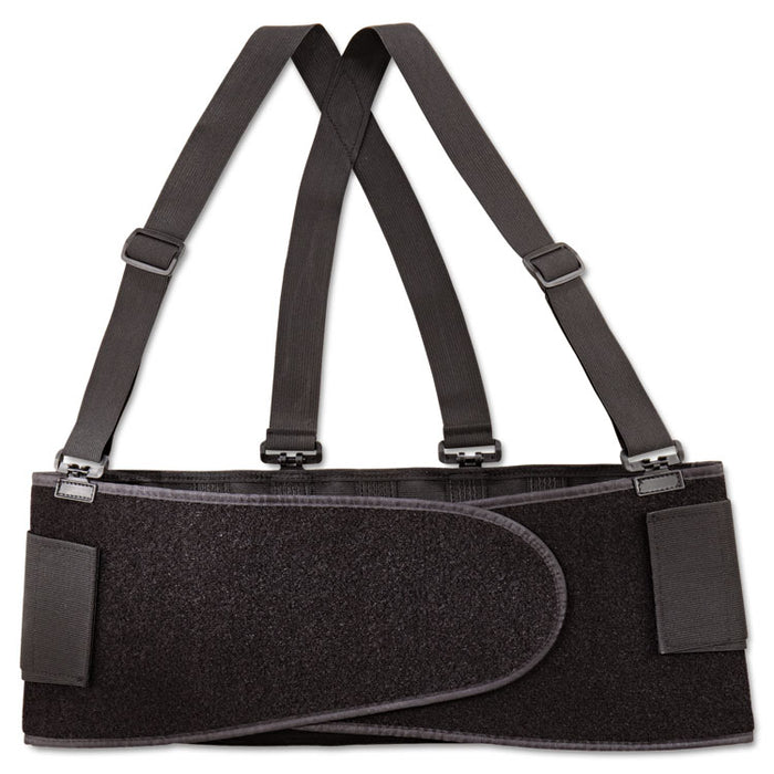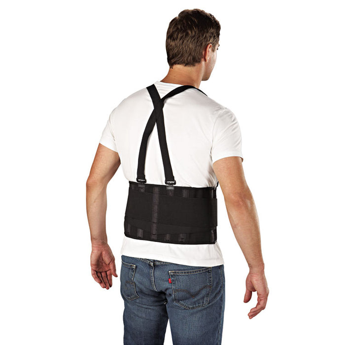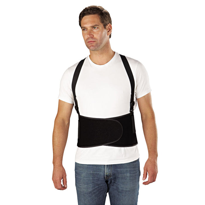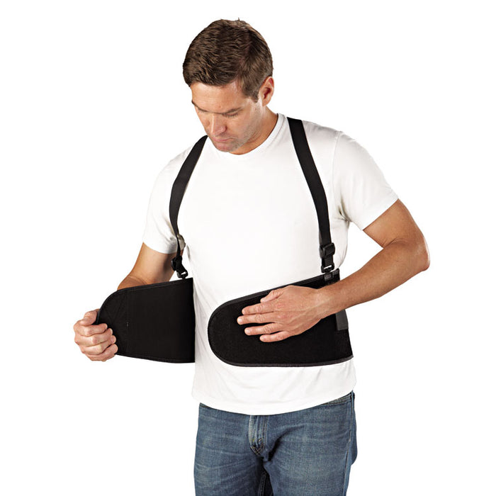 Economy Back Support Belt, Large, Black. Protects lower lumbar region and limits range of motion associated with most back injuries. Elastic back panels and elastic V-shaped side pulls provide consistent, even support. Elastic suspenders are detachable. Hook-and-loop closure front panels allow for adjustment. Back Support Type: Belt; Material(s): Nylon; Color(s): Black; Adjustability Features: Detachable Suspenders.