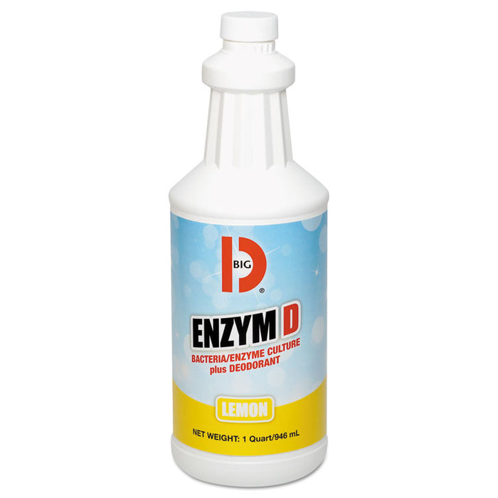 Enzym D Digester Liquid Deodorant, Lemon, 32 oz Bottle, 12/Carton. BIG D® ENZYM D digests organic waste and destroys odors associated with the decay of organic matter. It is highly effective in eliminating the organic salts associated with urine which cause odors. Specially bred enzyme/bacteria cultures attack and break down uric acid molecules by digesting the source, just the way nature does it– but in minutes rather than days or weeks. ENZYM D also contains BIG D® deodorant, which neutralizes odors on contact. Scent: Lemon; Physical Form: Liquid; Application: Odor Control; Capacity (Volume): 32 oz.