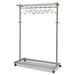 Garment Racks, Two-Sided, 2-Shelf Coat Rack, 6 Hanger/6 Hook, 44.8w x 21.67d x 70.8h, Silver/Wood. Stylish combination of steel tubing and wood detail. Features six accessory hooks and four casters, two locking. Holds up to 36 garment hangers. Six hangers included. Double-Sided, Two-Shelf Rack—Top and bottom shelves for storing hats and cases. Mounting: Stand Alone; Width: 44.8"; Depth: 21.67"; Height: 70.8".