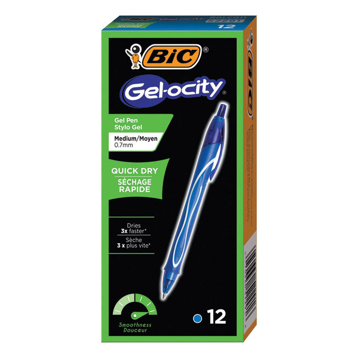 Gel-ocity Quick Dry Retractable Gel Pen, Medium 0.7mm, Blue Ink/Barrel, Dozen. Gel ink dries fast for less smearing. Provides a super smooth writing experience. Features a comfortable full grip barrel. Pen Sub-Brand & SKU Line: Gel-ocity™ Quick Dry; Pen Style: Retractable; Pen Type: Gel Pen; Refillable (Yes/No): No.
