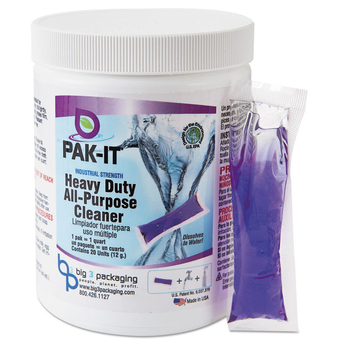 Heavy-Duty All-Purpose Cleaner, Pleasant Scent, 20 PAK-ITs/Jar, 12/Carton. Simply drop one pre-measured purple Heavy Duty All Purpose Cleaner PAK-IT® into its matching purple quart trigger spray bottle (sold separately) and add cold, tepid or warm water. Wait two minutes and shake. Adjust nozzle to mist setting and simply spray and wipe off with a clean microfiber cloth or ideally a paper towel. Non-aerosol, phosphate-free, ammonia-free formula still packs a serious punch making it both safe and effective on all surfaces. 20 PAK-It®s per Jar, 12 Jars per Carton. Application: Bathrooms; Counters; Kitchens; Desks; Shelves; Applicable Material: Ceramic; Fiberglass; Glass; Metal; Plastic; Stone; Vinyl; Wood; Dirt Types: Dust; Grease; Grime; Oil; Organic Matter; Soil; Scent: Pleasant.