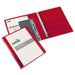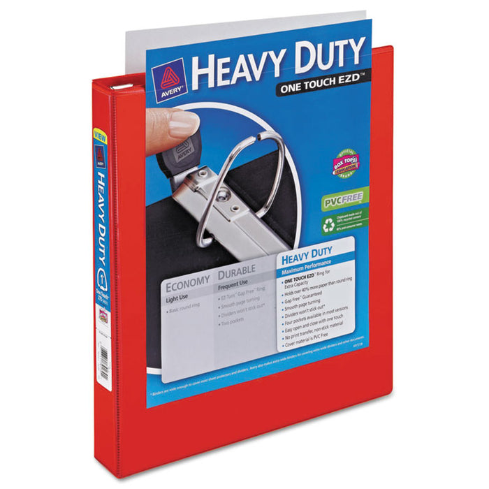 Heavy-Duty View Binder with DuraHinge and One Touch EZD Rings, 3 Rings, 1" Capacity, 11 x 8.5, Red. Heavy-Duty view binder with one touch EZD® rings is perfect for long-term, regular use. Tear-resistant DuraHinge® design is stronger and lasts longer. DuraEdge® feature makes the sides and top more pliable, providing greater split resistance. Deep-textured film offers a smoother finish and features a linen pattern for a high-quality look and feel. Clear cover and spine for easy customization. Four clear, interior pockets provide extra storage space. Wider front and back panels fully cover standard dividers and sheet protectors. One touch EZD® rings provide easy access and have a higher page capacity when compared to the same size round rings. Customize the cover with free, easy-to-use templates and designs at Avery® Design & Print online. Binder Type: Ring; Binder Style: View; Binder Size Capacity: 1"; Binder Sheet Capacity: 275.