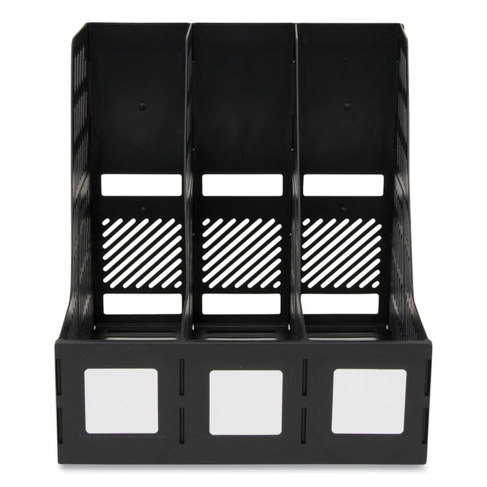 Literature File, Three Slots, Black. Keep magazines, catalogs, file folders and other literature neat and accessible. Separate compartments help organize materials. Ships flat and snaps together, no tools required. Large labeling area on front to clearly identify contents; white labels included. Durable plastic. Three Compartments. Magazine Files Type: Desktop; Material(s): Plastic; Width: 10"; Depth: 10".